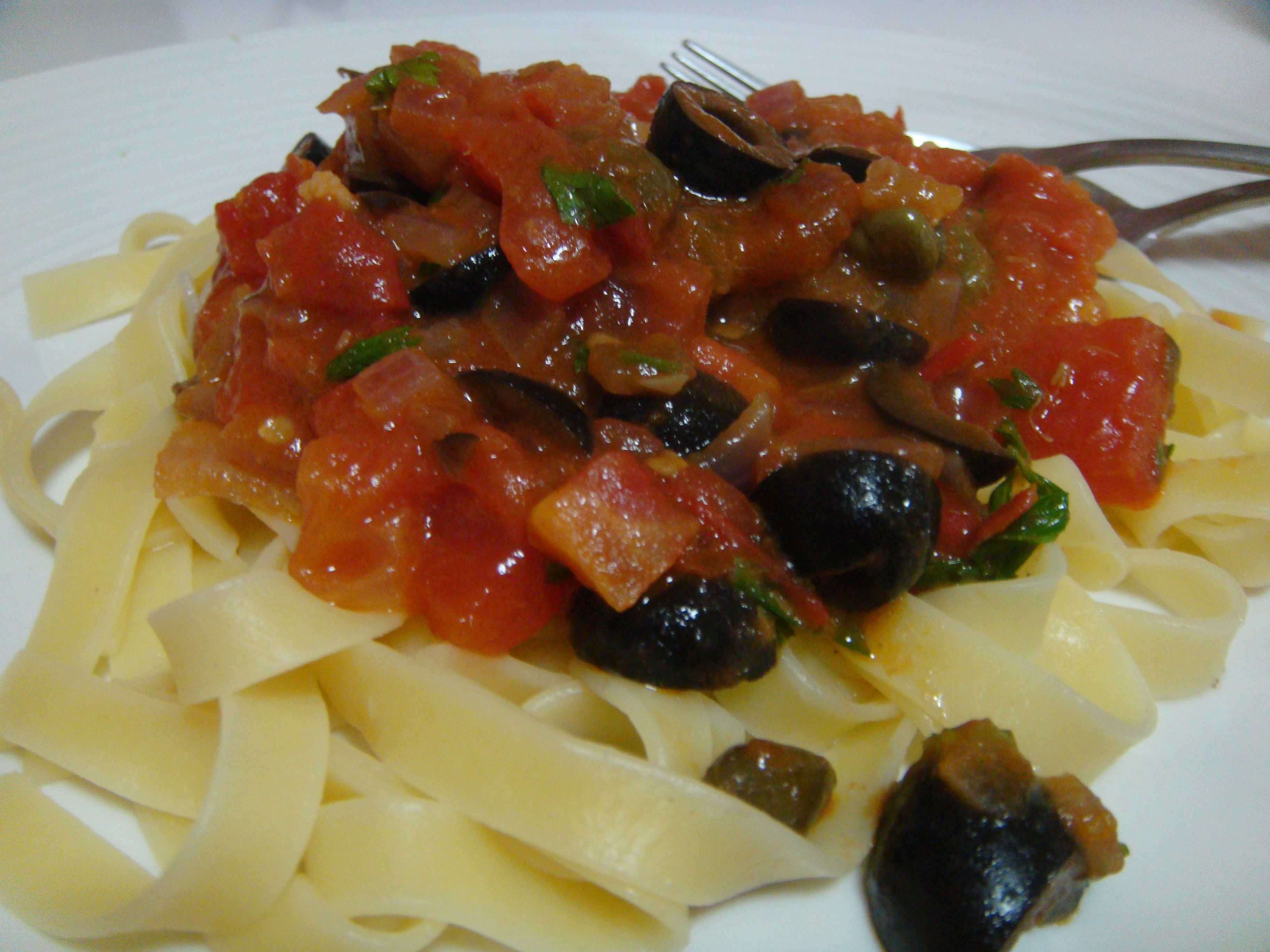 Putanesca is one of my all time favorite dishes to make when I’m coming home late (because it is so quick and easy), or even if I have nothing else in my cupboard, I know I will ALWAYS have tomatoes, capers and olives and some kind of fresh and dried herb kicking about my cupboard or fridge. Throw all these ingredients together – and you have made a fantastic sauce be it for pasta, grilled chicken, a firm white fish or even grilled Portobello mushrooms!