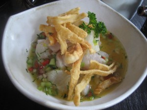 The ceviche was actually very good. The fish was fresh and firm, the marinade was not too tart and very refreshing, and you could taste the Japanese influence with the ginger and soya. My only criticism of this dish, was that it had deep-fried calamaries on top (which I love) but they had become cold and soggy – if they had still been crunchy this would have been an absolute winner as the flavours were all there.