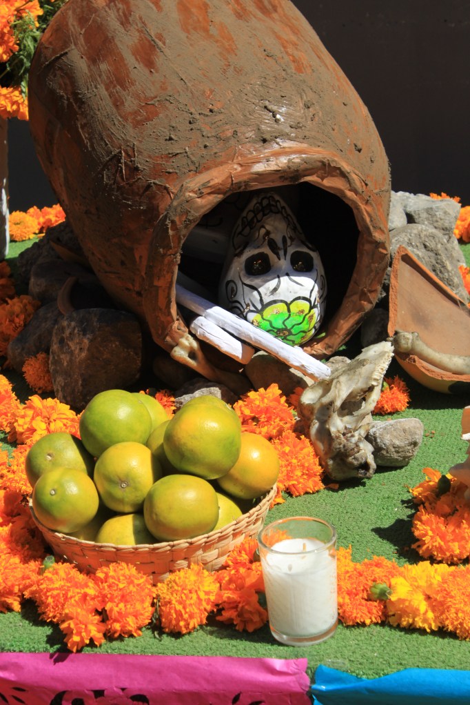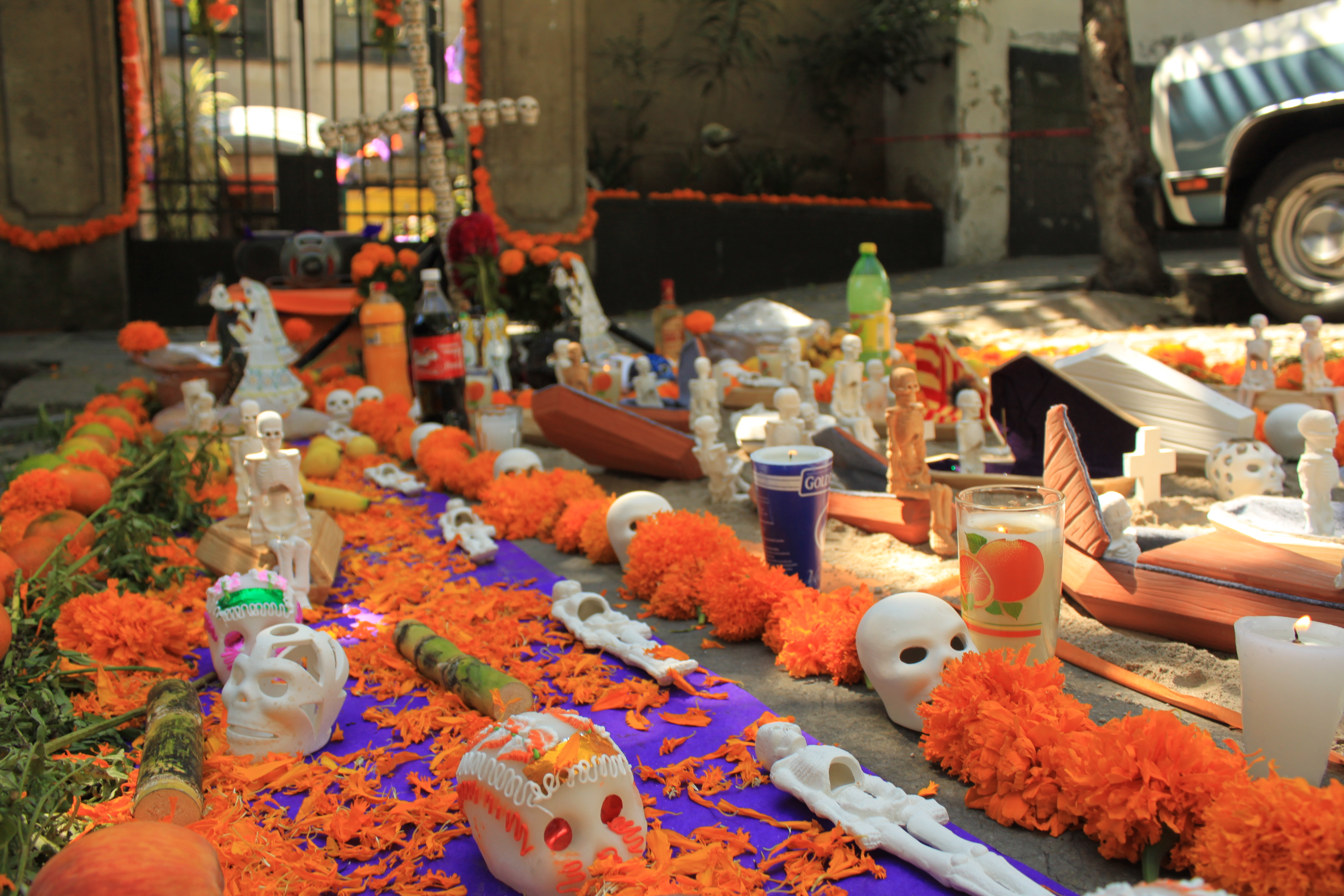 This is why to the run-up to dia de los muertos you will see offerings or offrendas all over the city, as well as intricate alters not only in people’s homes but the plazas, the shops and  even the metro station. The alters are made up of marigolds whose scent is believed to attract the soul back to earth, the departed’s favourite food and drink,  a photo of the deceased relative and possibly some item of clothing, and of course wooden sculls or sculls made out of sugar.