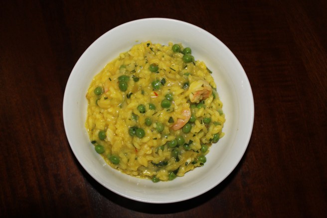 A few days ago, I saw this amazing looking saffron risotto on one of the blogs that I follow called Eating Deliciously, and the minute I saw it I just knew I had to make it, and as C was out of town I thought this would be the ideal time to do so. As I may have mentioned a few times previously *ahem* I love my rice dishes, but C is rather indifferent to rice as he is more of a potato man (a true Peruvian at heart!). Although he does eat rice, and has enjoyed the few risottos I have made in the past – I feel that I can never really relax and enjoy my risotto when he is around, as I feel he is judging me when I have my massive bowl of risotto and he has a couple to tablespoons!!