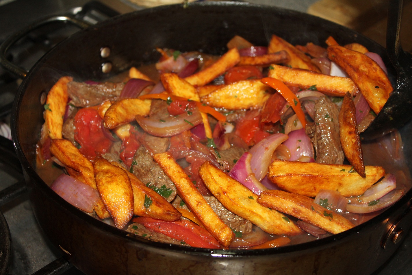 2. im peruvian and this dish “lomo saltado” does not have any bell peppers or peanut oil the original peruvian lomo saltado main ingredient is soy sauce…so simple tomatoes,red onions,beef,potato and soy sauce some places add little of white wine. thanks!