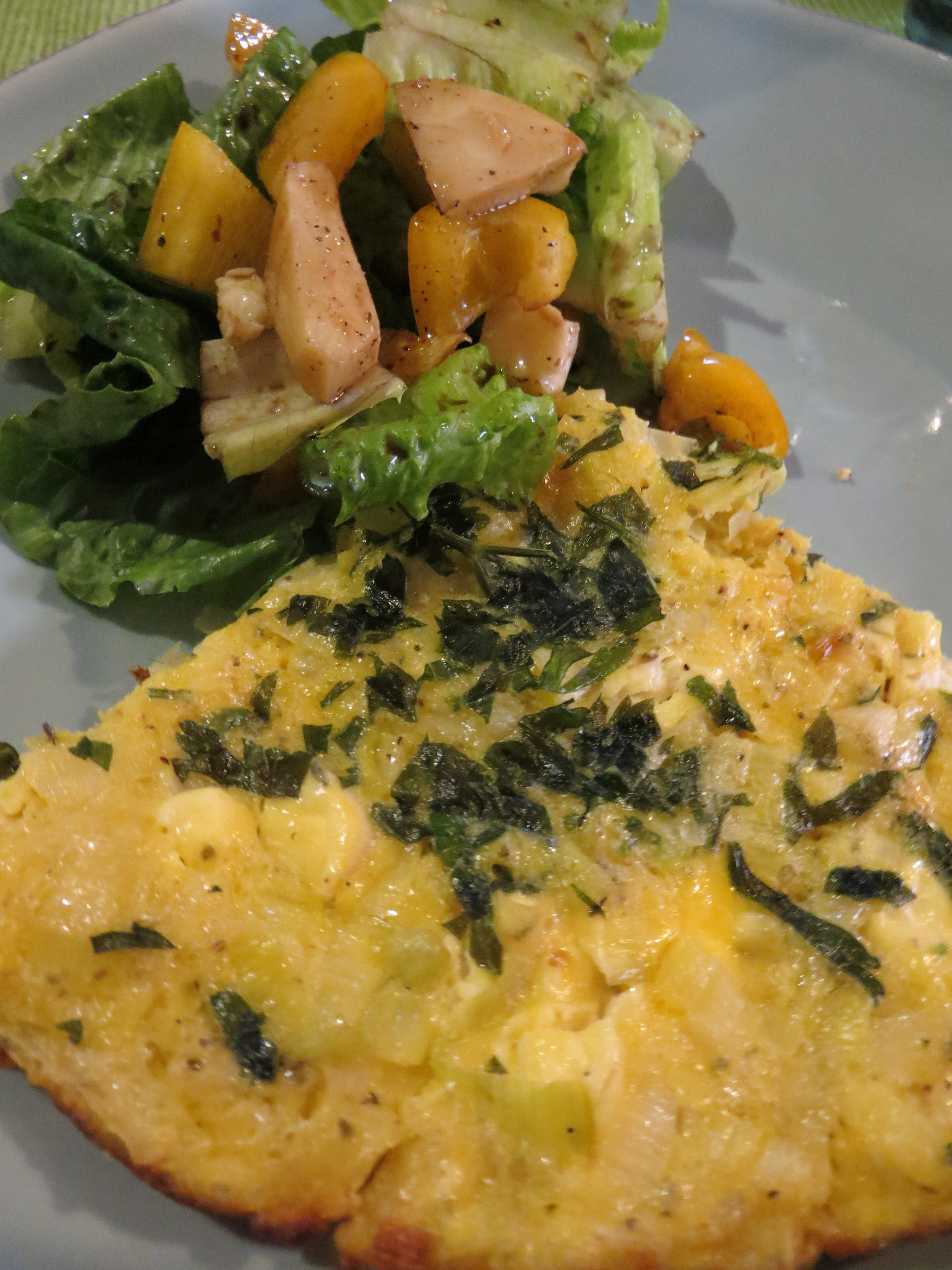 I used my normal skillet, and although it looked really good when it came out of the oven – there was no way I could ‘slide’ the frittata onto a plate. I tried to flip over the skillet and bang it on the counter, hoping to loosen the egg mass, which resulted in chunks of the frittata falling off – I could see this wasn’t going to be pretty.