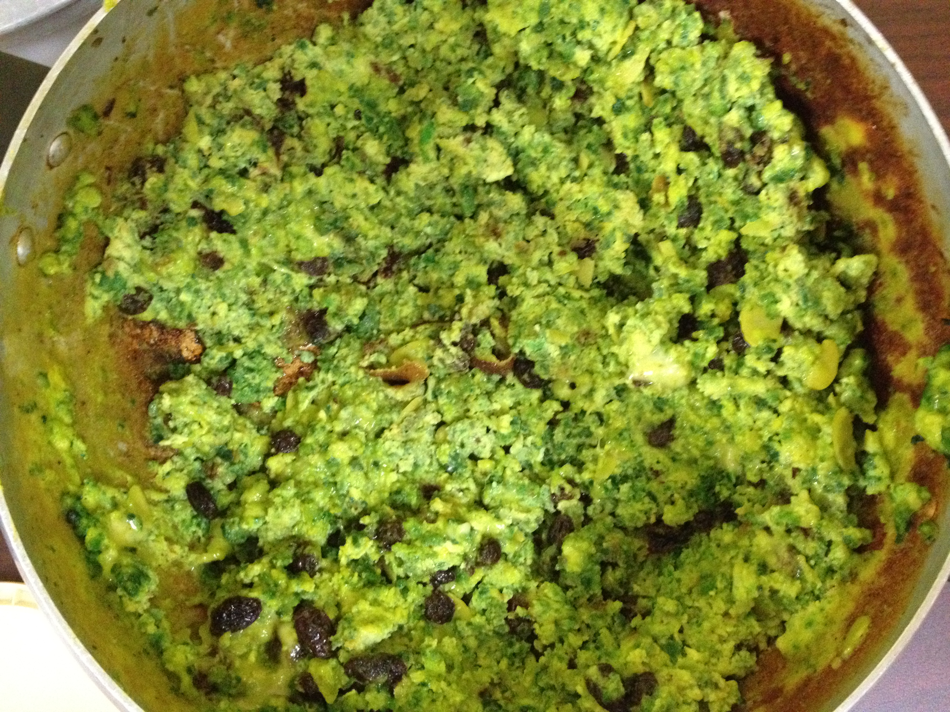 What Luis does, is he breaks the sausage links in a big pot and fries the meat, he adds raisins and almonds, a whisked egg in milk and after the meat is cooked through and just before it is finished he adds a generous portion of cheese. Once the cheese has melted you are left with the most delicious pot of green ozzy goodness.