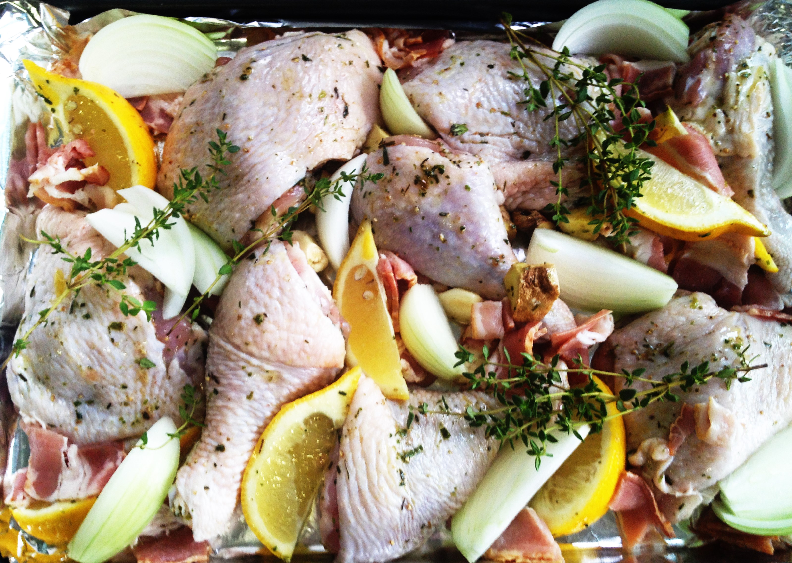 Once the baking tray is hot, place the chicken skin-up on the baking try. Scatter the onion wedges, bacon strips, garlic cloves, ginger, sprigs of fresh oregano and the lemon wedges (apart from one) evenly onto the tray.