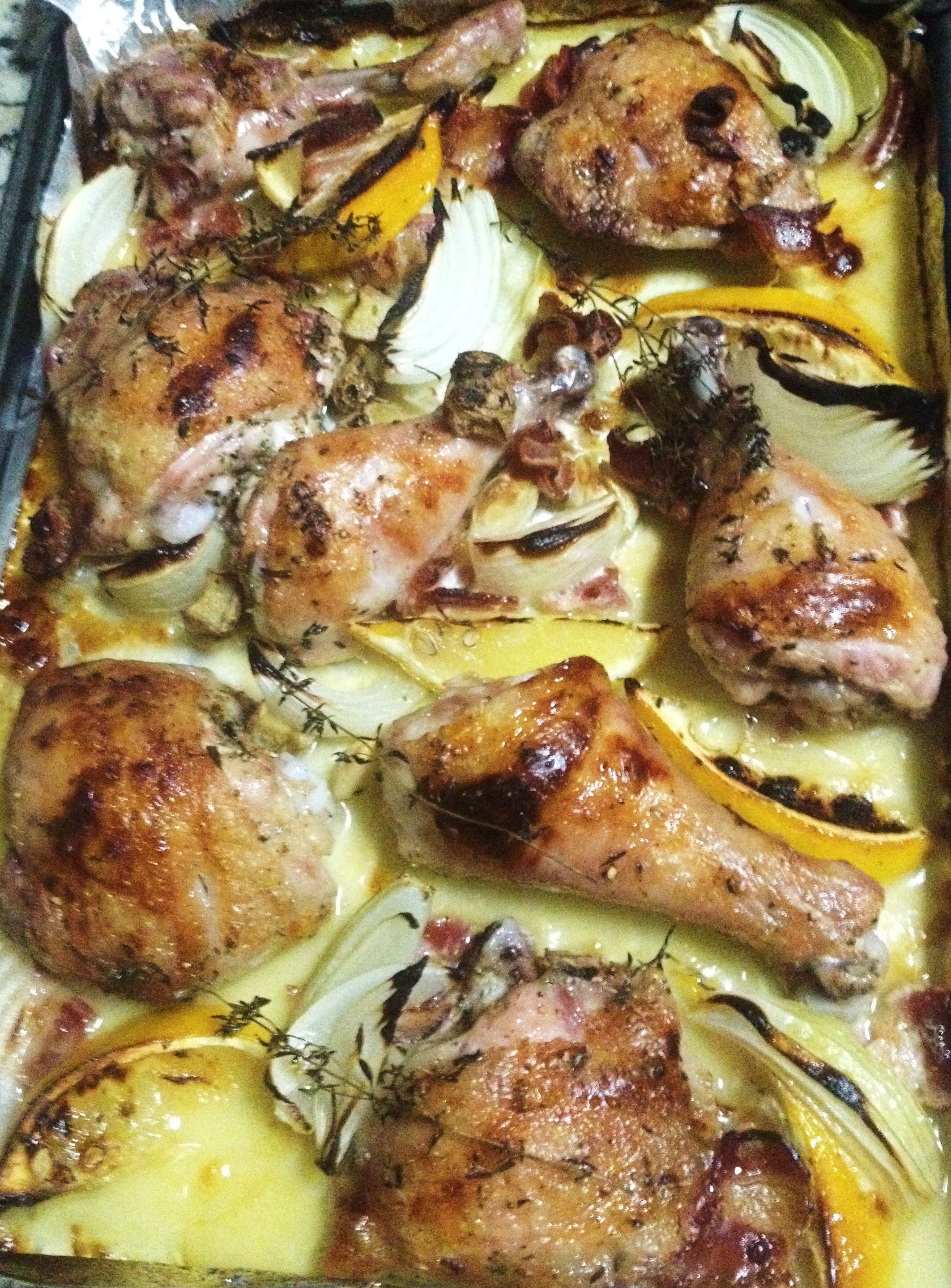 So I took to the internet yet again in search for some inspiration and found a very simple recipe from BBC Good Food (click here for the original recipe). I changed it around a bit to suit what I had at home and I have to say I am really impressed with the outcome. The chicken thigh and drumsticks were incredibly moist, the skin with nice and crispy and the lemon flavour really shone through but did not overpower.