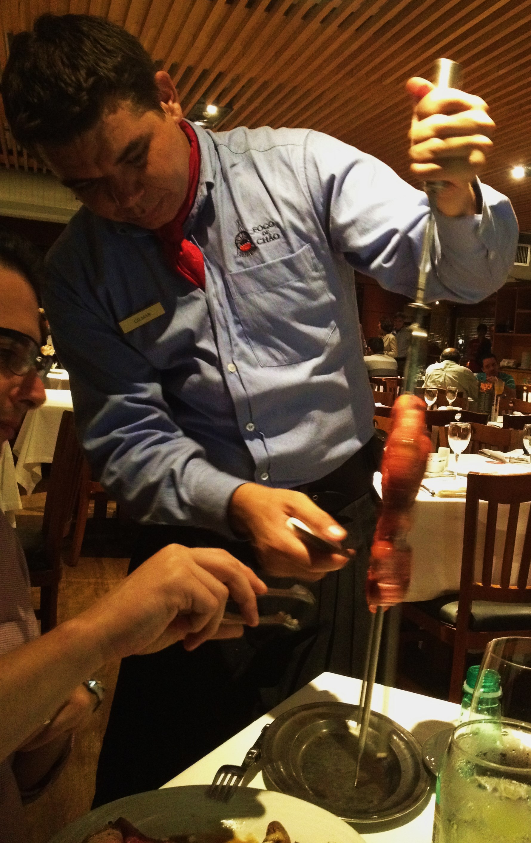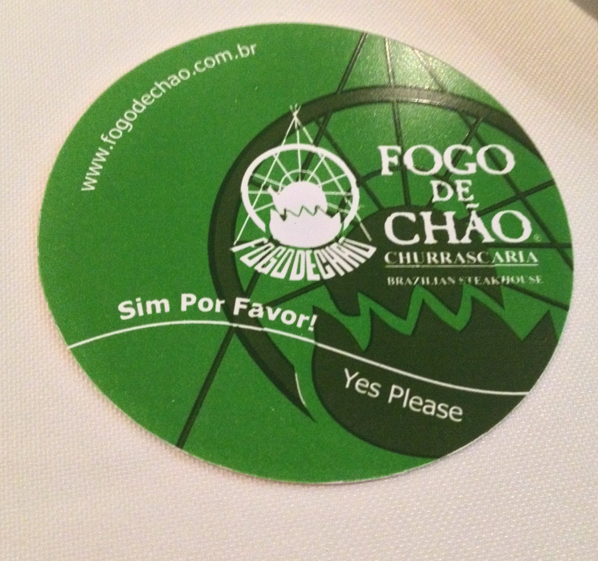 Like in most churrascarias abroad, you get a little coaster, green on one side and red on the other. When the the green side facing up, the passadores will come by and immediately serve you, however if you have the red side facing up, they will politely walk past your table, until you are ready for more.
