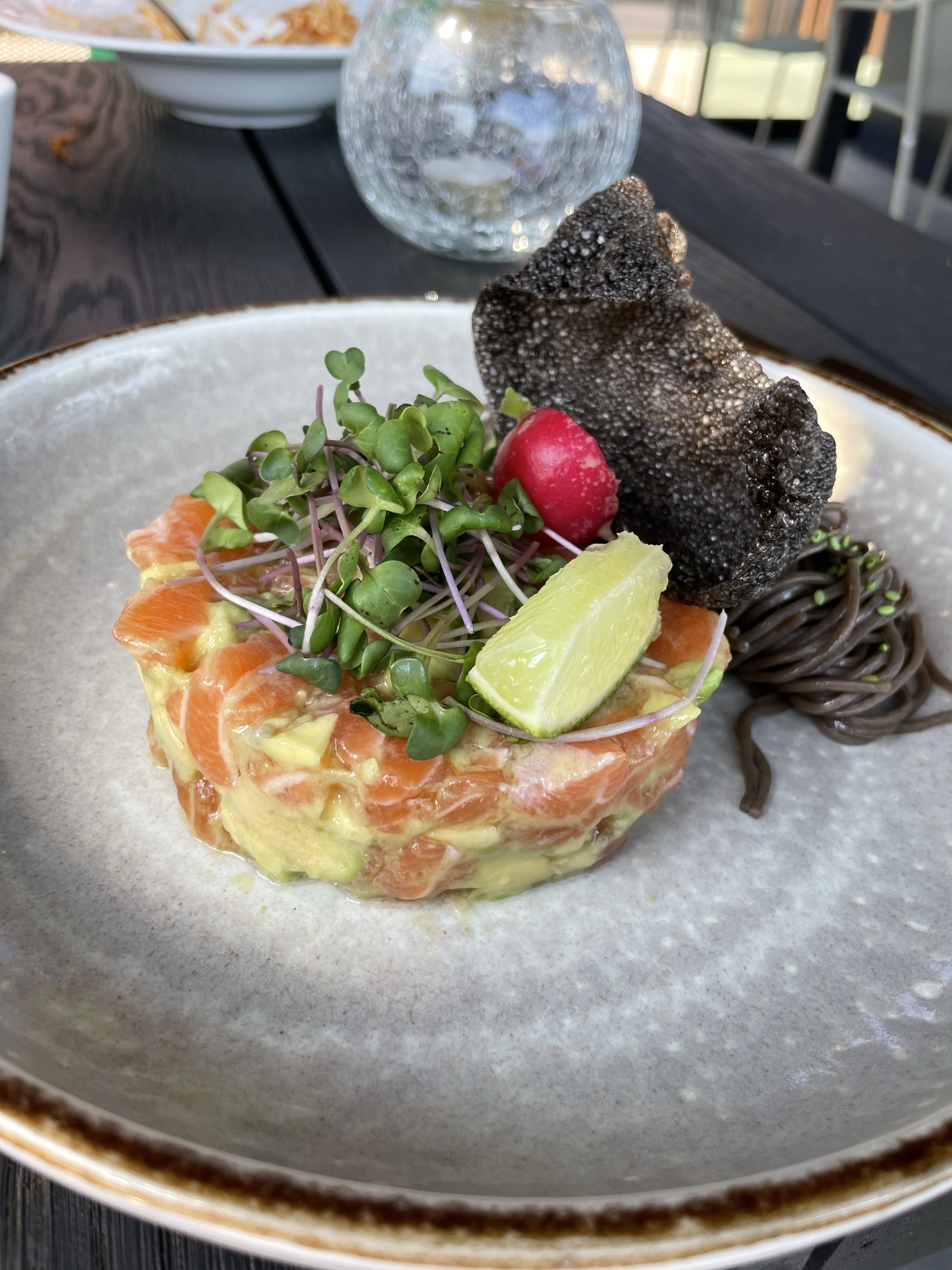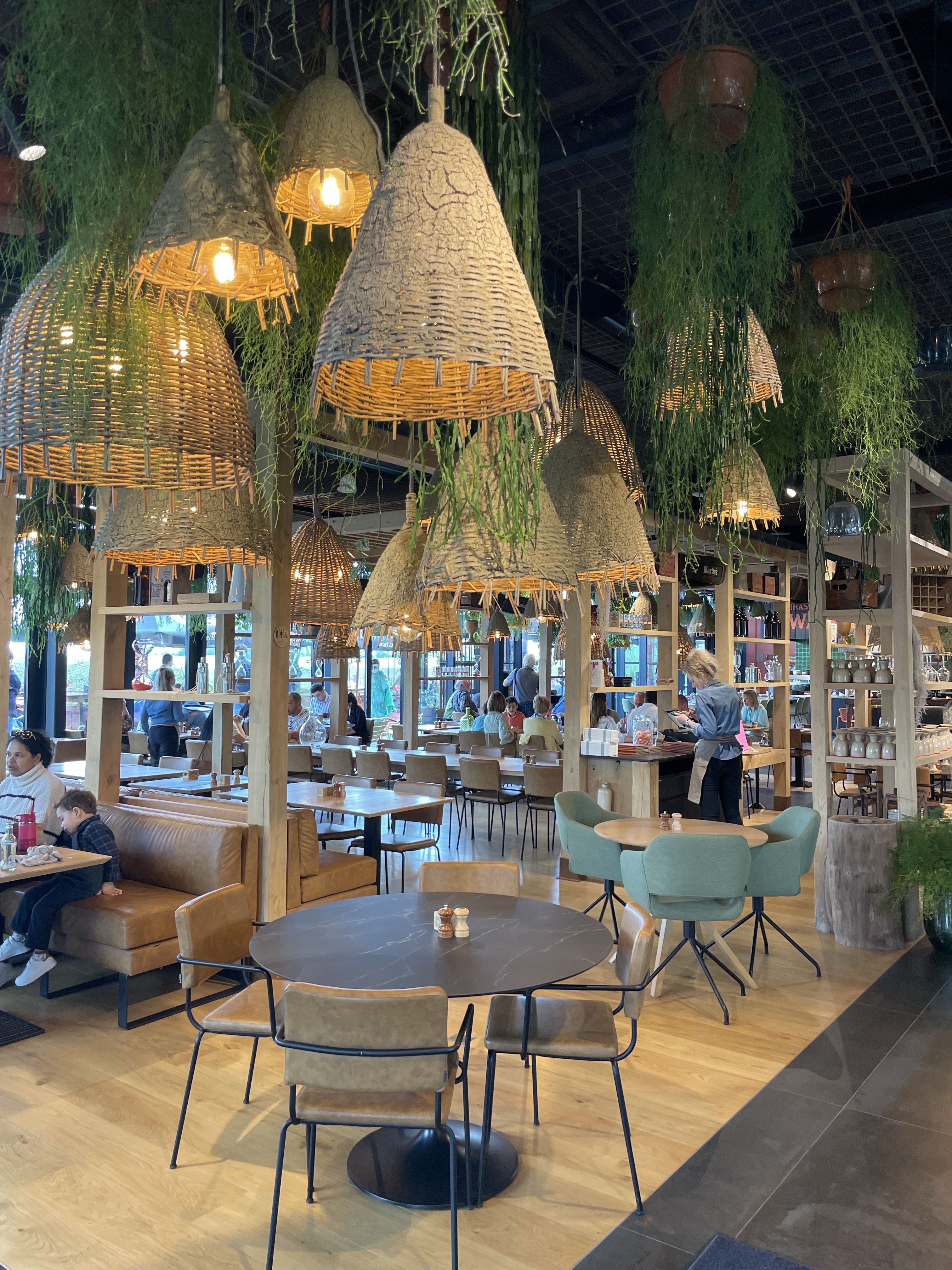 The restaurant is in a modern yet unassuming building across the courtyard from the old farm. Built almost entirely of steel and glass, the interior is light and airy, and surprisingly welcoming with its warm wood tones and natural palate which is complimented with the abundance of vibrant green hanging-plants. You are also able to view part of the brewing process through the internal windows if you are sitting inside.